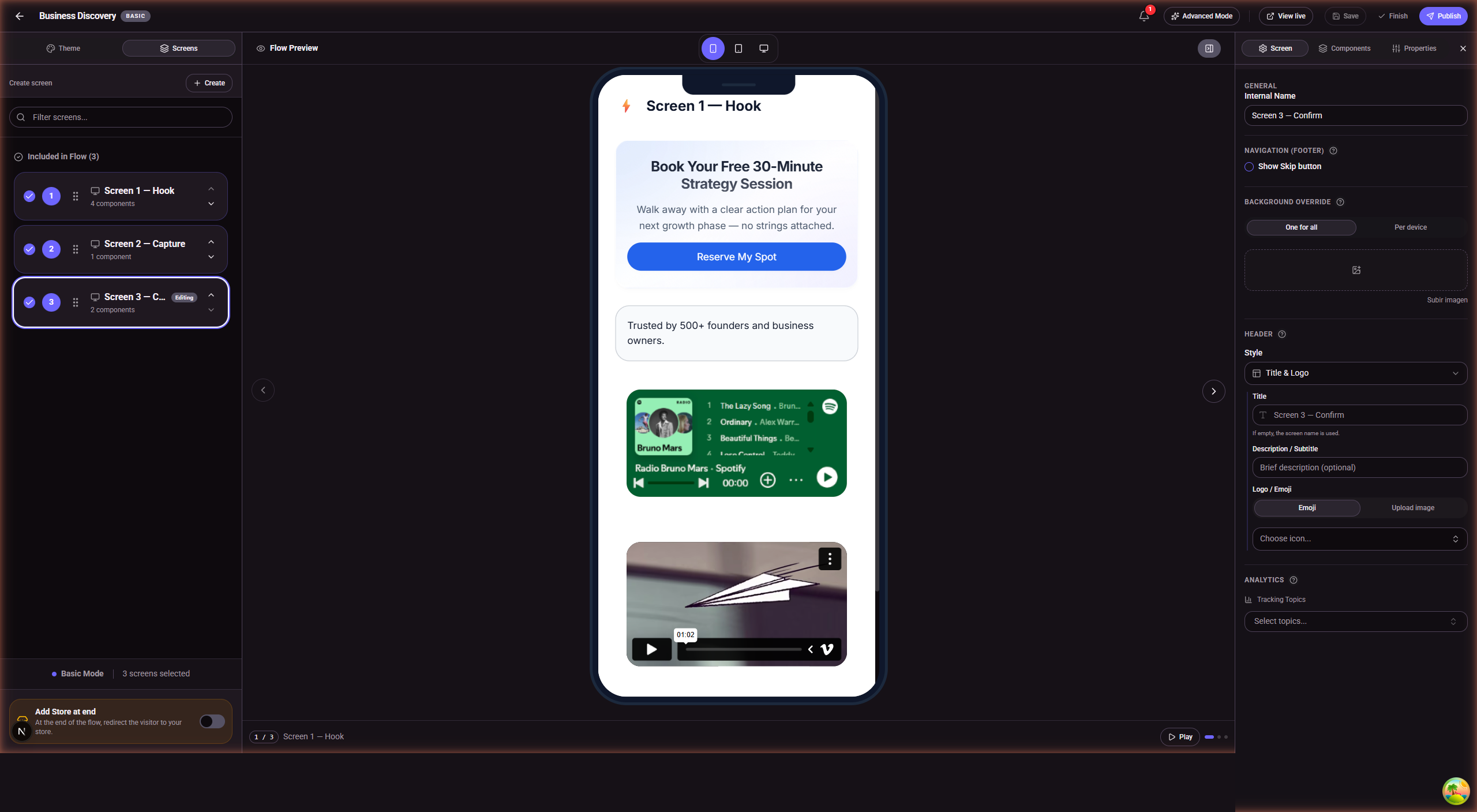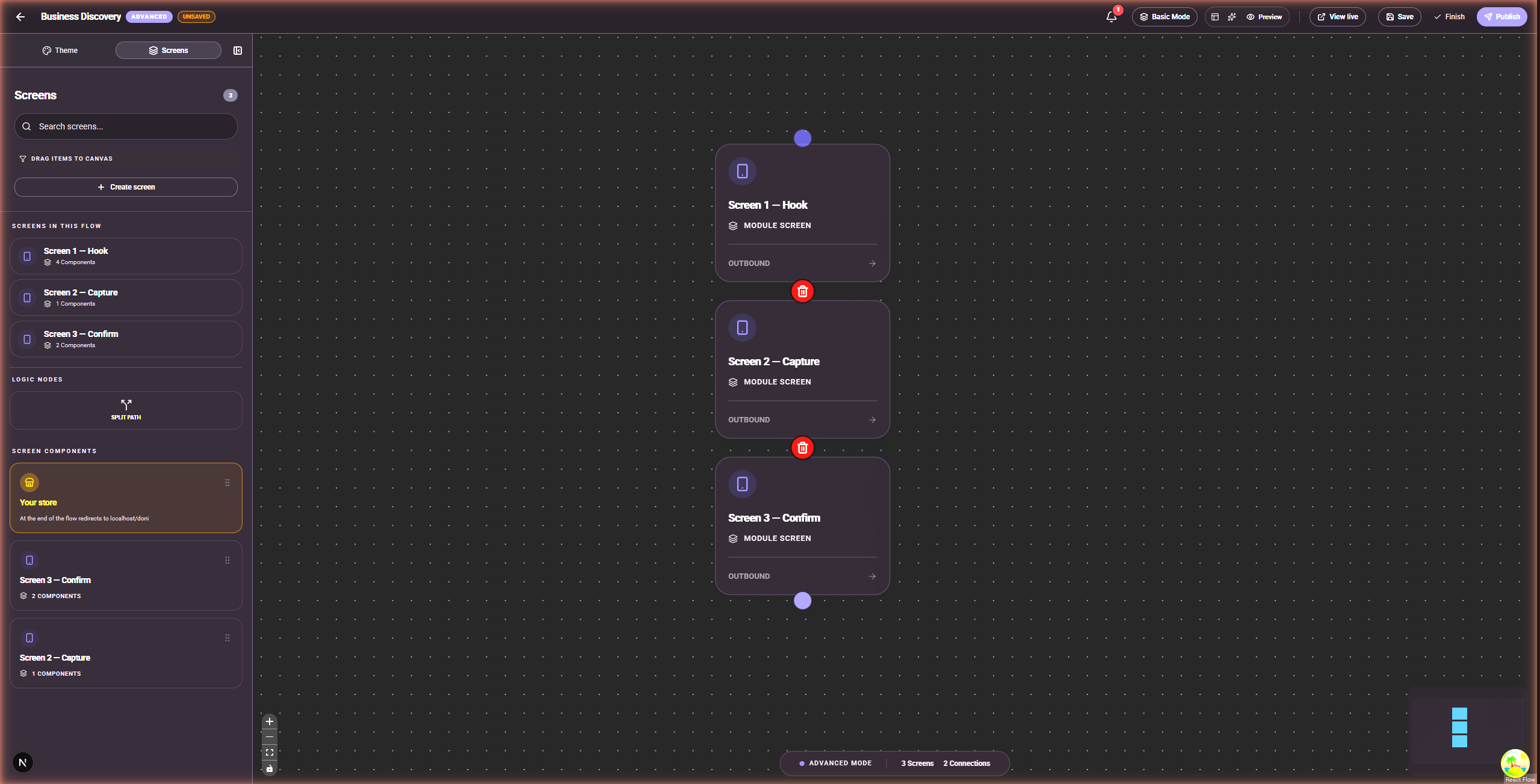 SellB.io incluye un constructor visual de flujos completo con dos modos. En modo Básico, creas una secuencia lineal de pantallas: Hook (captar atención) → Capture (recoger información) → Confirm (entregar valor o dirigir al siguiente paso). En modo Avanzado, diseñas embudos ramificados en un lienzo de arrastrar y soltar — conectando pantallas y añadiendo nodos de split path que envían visitantes por diferentes caminos según sus respuestas.