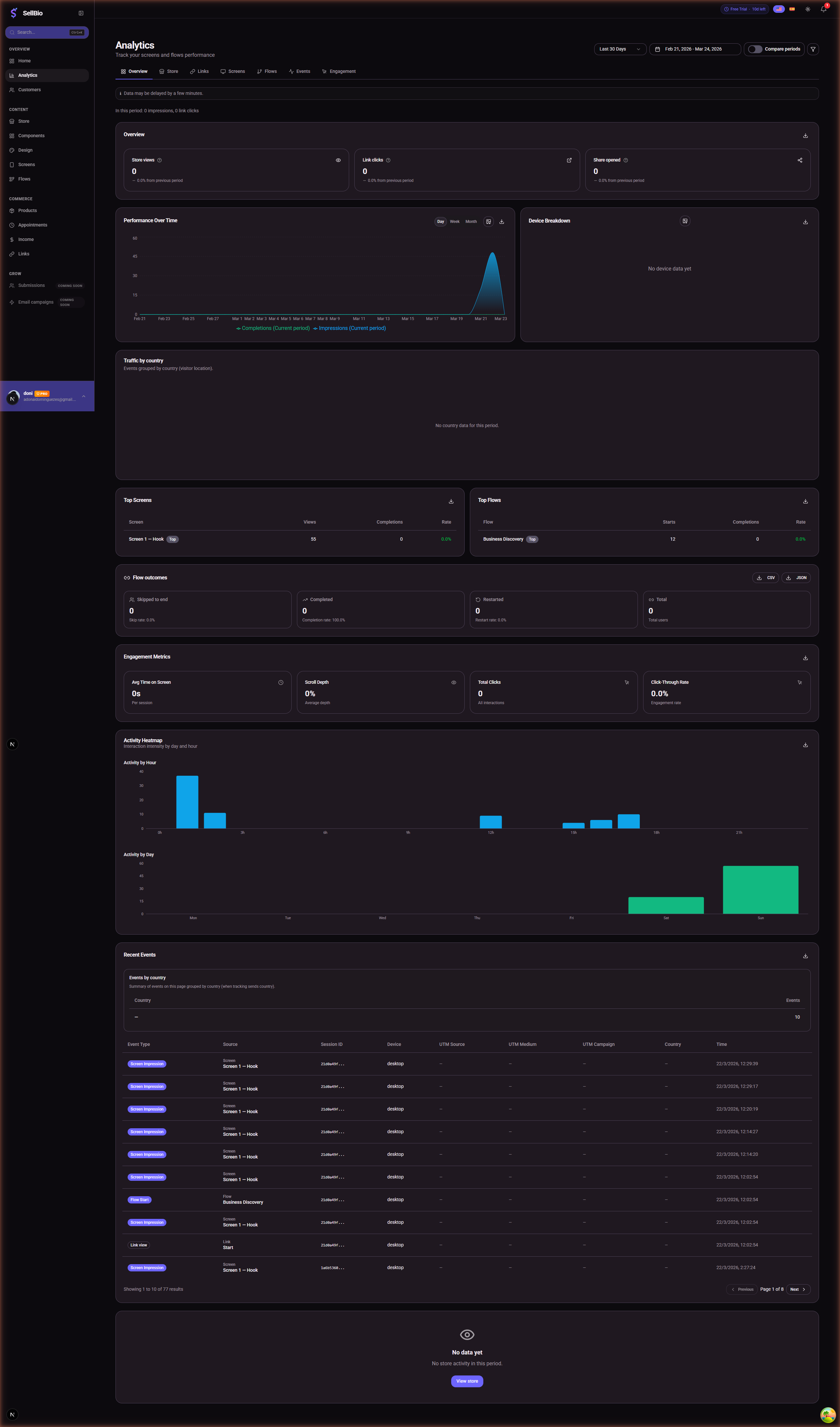 SellB.io te permite empezar gratis y mejorar cuando lo necesites. Crea tu tienda, construye tu primer flujo y observa cómo interactúan los visitantes con tu contenido — todo sin ingresar tarjeta de crédito.
