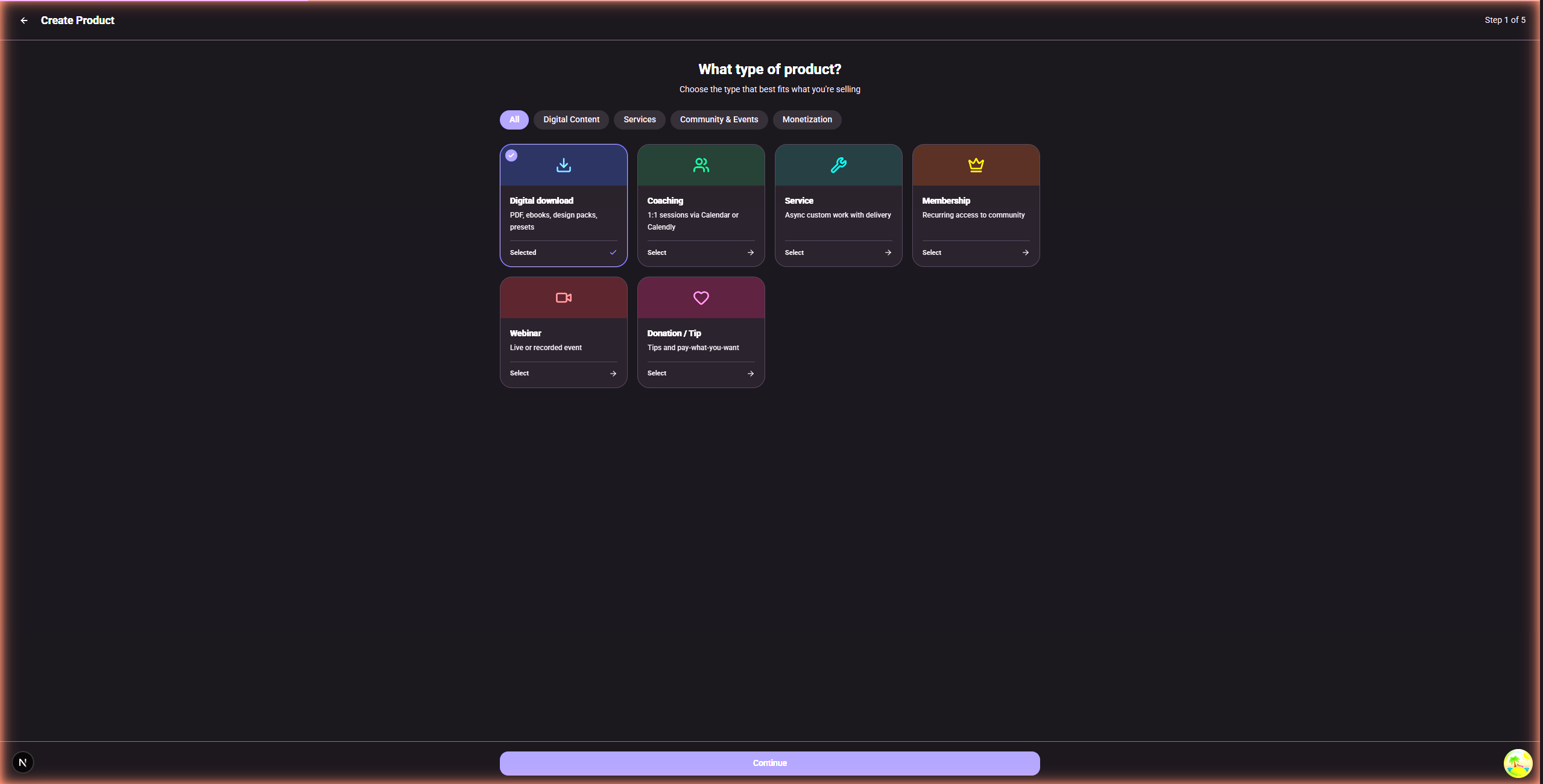 SellB.io ofrece seis tipos de producto a través de un wizard paso a paso: Descargas Digitales (PDFs, ebooks, packs de diseño, presets), Coaching (sesiones 1:1 vía Calendar o integración con Calendly), Servicios (trabajo personalizado asíncrono con entrega), Membresías (acceso recurrente a comunidad), Webinars (eventos en vivo o grabados) y Donaciones/Propinas (paga lo que quieras). Los pagos van directamente a tu cuenta de Stripe vía Stripe Connect.